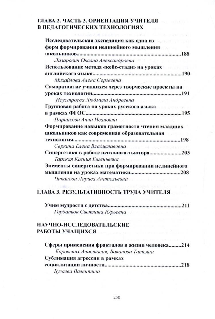 Данная книга состоит из 3-х глав. В 1-й главе представлены статьи преподавателей ИРОиПК о реформе системы образования, об ориентации учителя на овладение профессиональными компетентностями в соответствии с Профстандартом, который будет действовать с 2017 года. Во 2-й главе - статьи научного руководителя проекта Степановой Т. И., Кеошенгольц Б. А. как научно-теоретическое обоснование использования синергетики в педагогике, также статьи учителей СОШ N15 об инновационной деятельности. В 3-й главе представлены работы учащихся как демонстрация результативности труда учителя