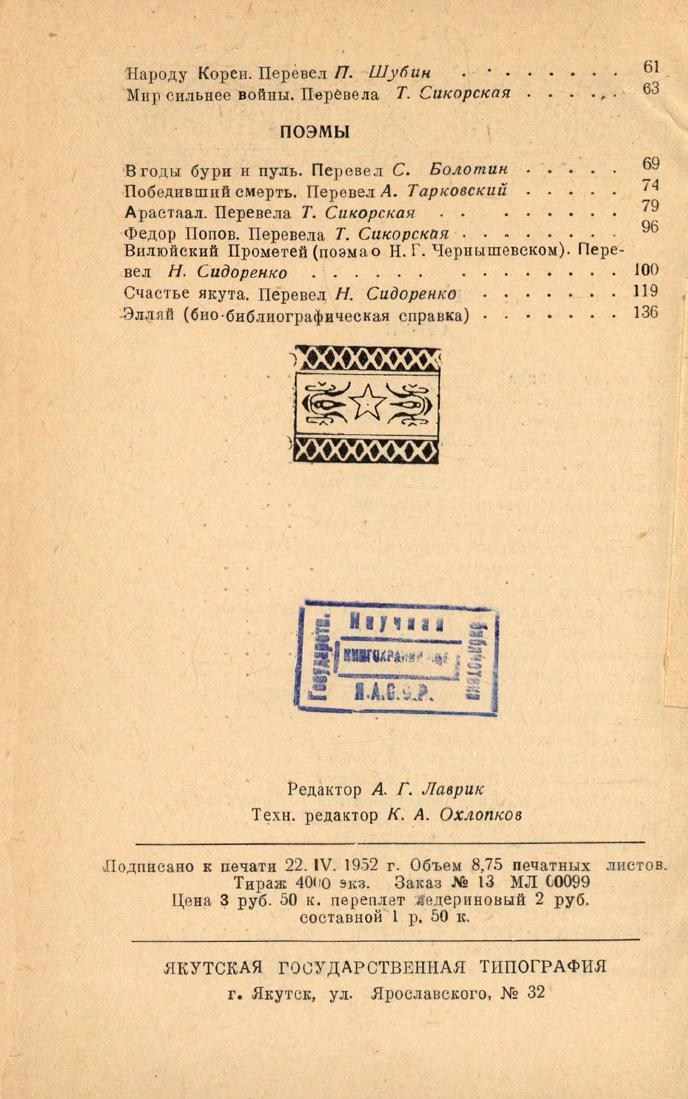 Счастье якута : Стихи и поэмы. - Якутск : Книжное издательство, 1952. - 140 с. 1 л.
