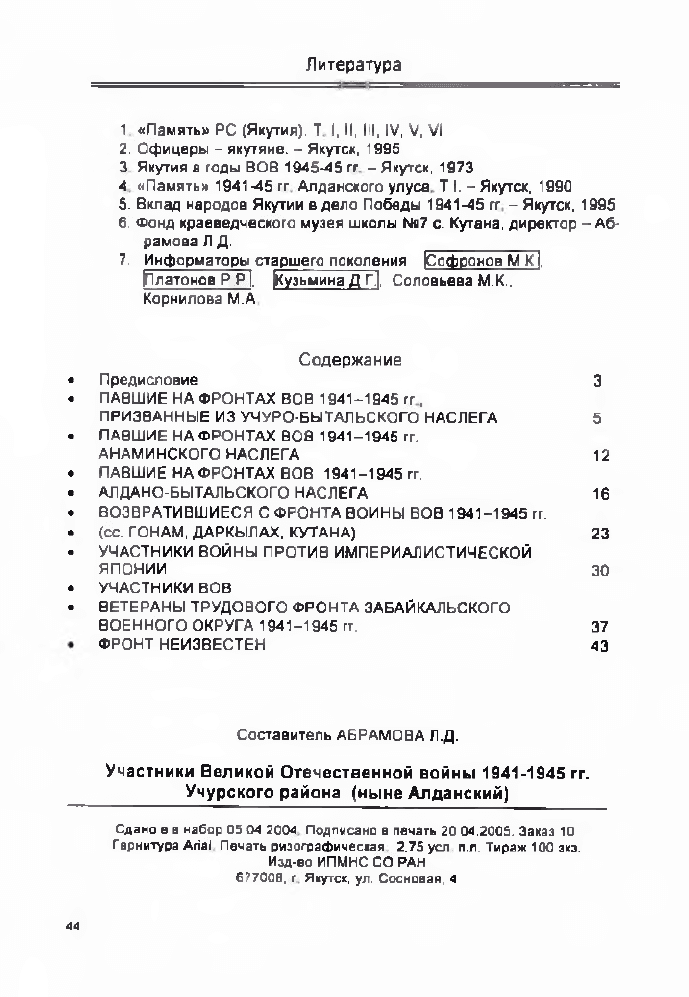 Участники Великой Отечественной войны 1941- 1945 гг. Учурского района (ныне Алданский) . - Якутск : Изд-во ИПМНС СО РАН, 2005. - 44 с. :