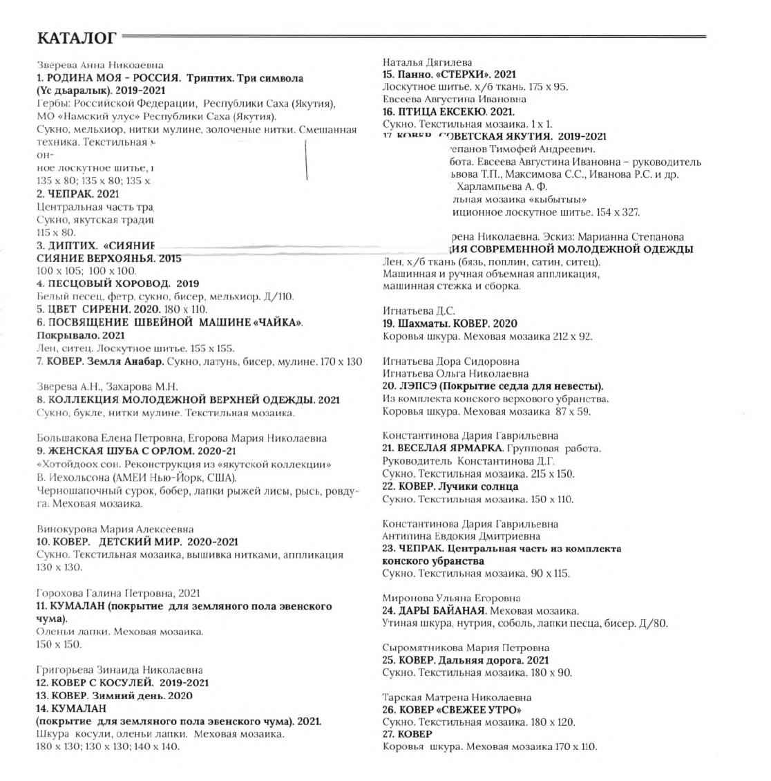 Текстильная мозаика (якутское "кыбытыы"). Меховая мозаика : каталог / Министерство внешних связей по делам народов Республики Саха (Якутия), Оргкомитет Международного фестиваля "Душа России", Региональная авторская школа Анны Зверевой ; составитель А. Н. Зверева. - Якутск : Медиахолдинг "Якутия", 2021. - 24 с. : цв. ил. ; 20 см. - (Мир женщины Севера). - ISBN 978-5-471-00794-9.