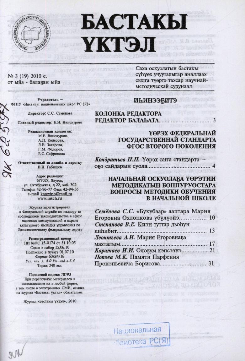 - 2. Бастакы үктэл: саха оскуолатын бастакы сүһүөх учууталыгар аналлаах научнай-методическай сурунаал, 2010, №2 (18) (муус устар - бэс ыйа)
