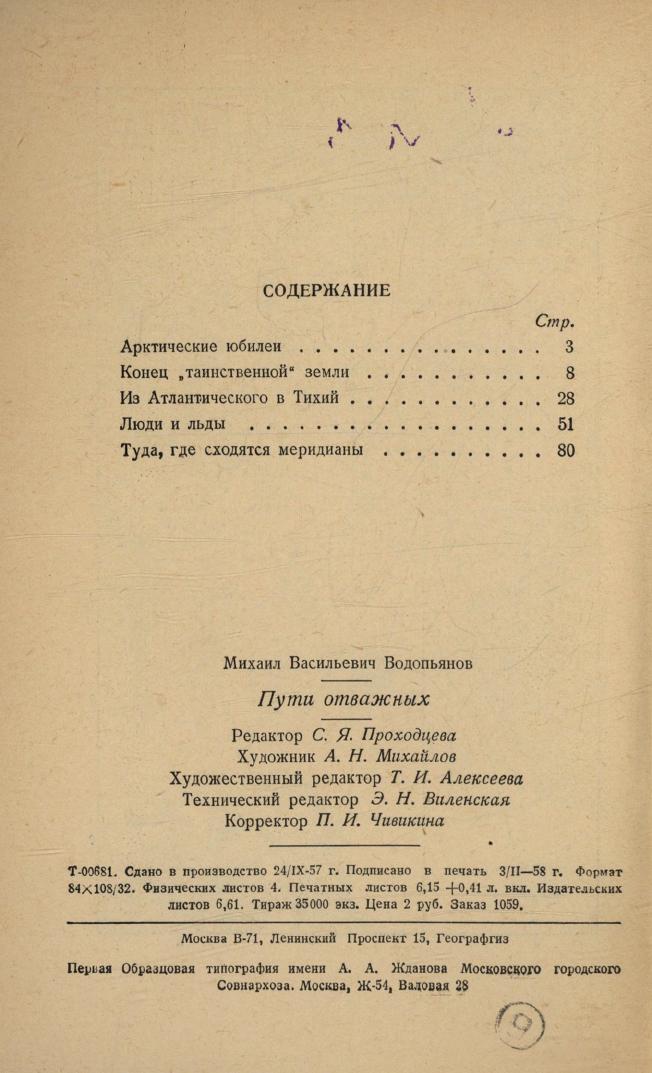 Книга Героя Советского Союза М. В. Водопьянова "Пути отважных" увлекательно рассказывает о непроходящей романтике познания человеком Северного Ледовитого океана и арктических просторов. В живой и красочной форме она повествует о славных подвигах наших полярников и ученых, о наиболее выдающихся экспедициях в высокие широты за 40 лет советской власти. В ней перебрасывается мостик от истории освоения Дальнего Севера к нынешней научной работе в Арктике, которую ведут мужественные зимовщики на дрейфующих станциях. Автор, сам известный полярник, показывает Арктику как край чудесных приключений. Выход в свет книги приобретает особо актуальное значение в связи с тем, что в 1957 г. исполнилось четыре арктических юбилея: двадцатипятилетие нанесения на карту Северной Земли, двадцатипятилетие похода ледокола "Сибиряков" по Северному морскому пути, четверть века работы Главного управления Северного морского пути и двадцатилетие организации научной станции "Северный полюс-1"