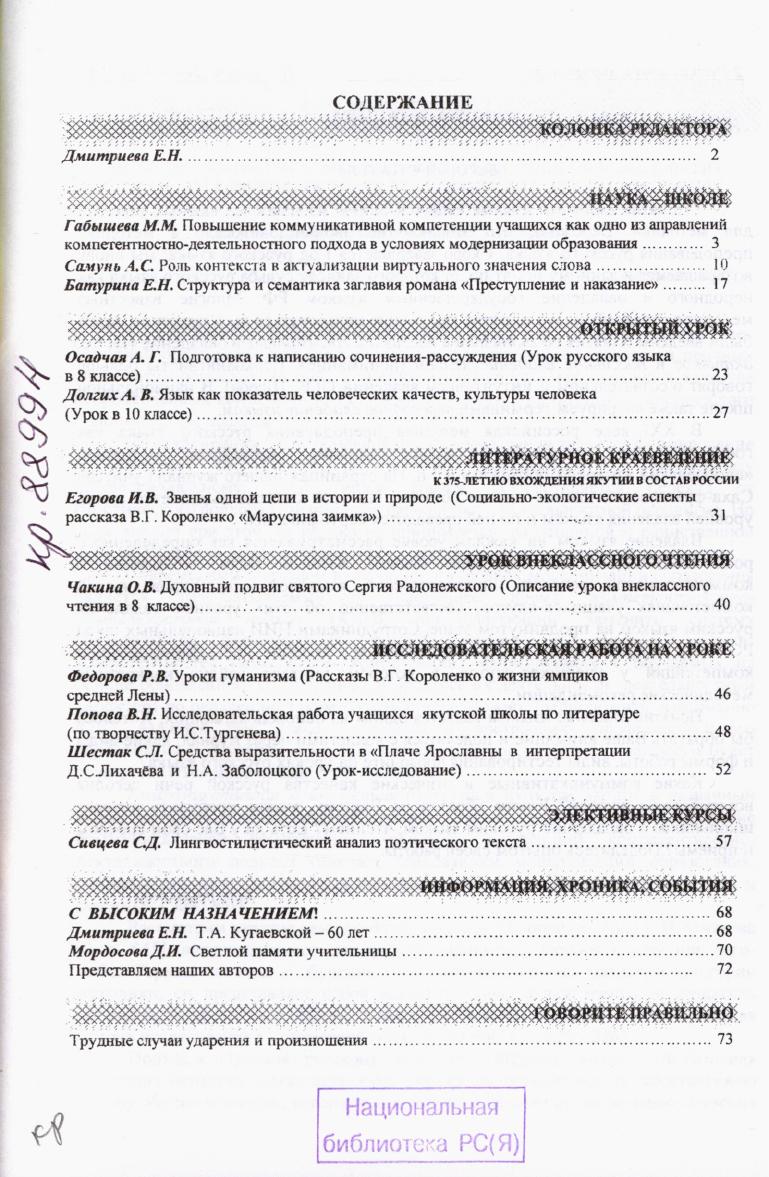 - 2. Русский язык и литература в якутской школе: ежеквартальный научно-методический журнал для учителей русского языка национальной школы, 2007, №2 (6)