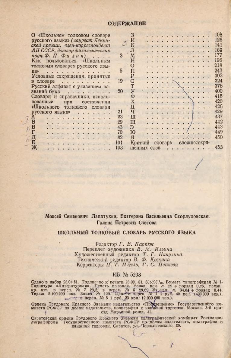 Школьный толковый словарь русского языка : пособие для учащихся / М. С. Лапатухин, Е. В. Скорлуповская, Г. П. Снетова ; под редакцией Ф. П. Филина. - Москва : Просвещение, 1981. - 463 с.