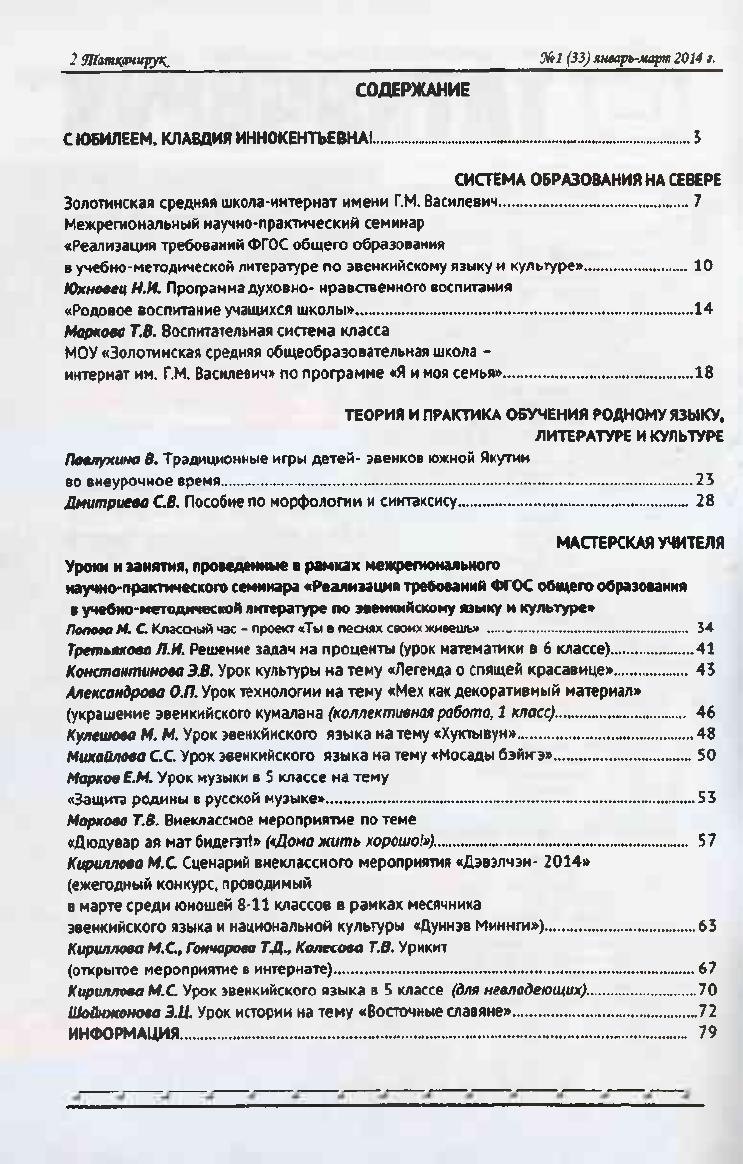 - 1. Таткачирук: научно-методический журнал для учителей, педагогов образовательных учреждений коренных малочисленных народов Севера Республики Саха (Якутия), 2014, №2 (апрель-июнь)