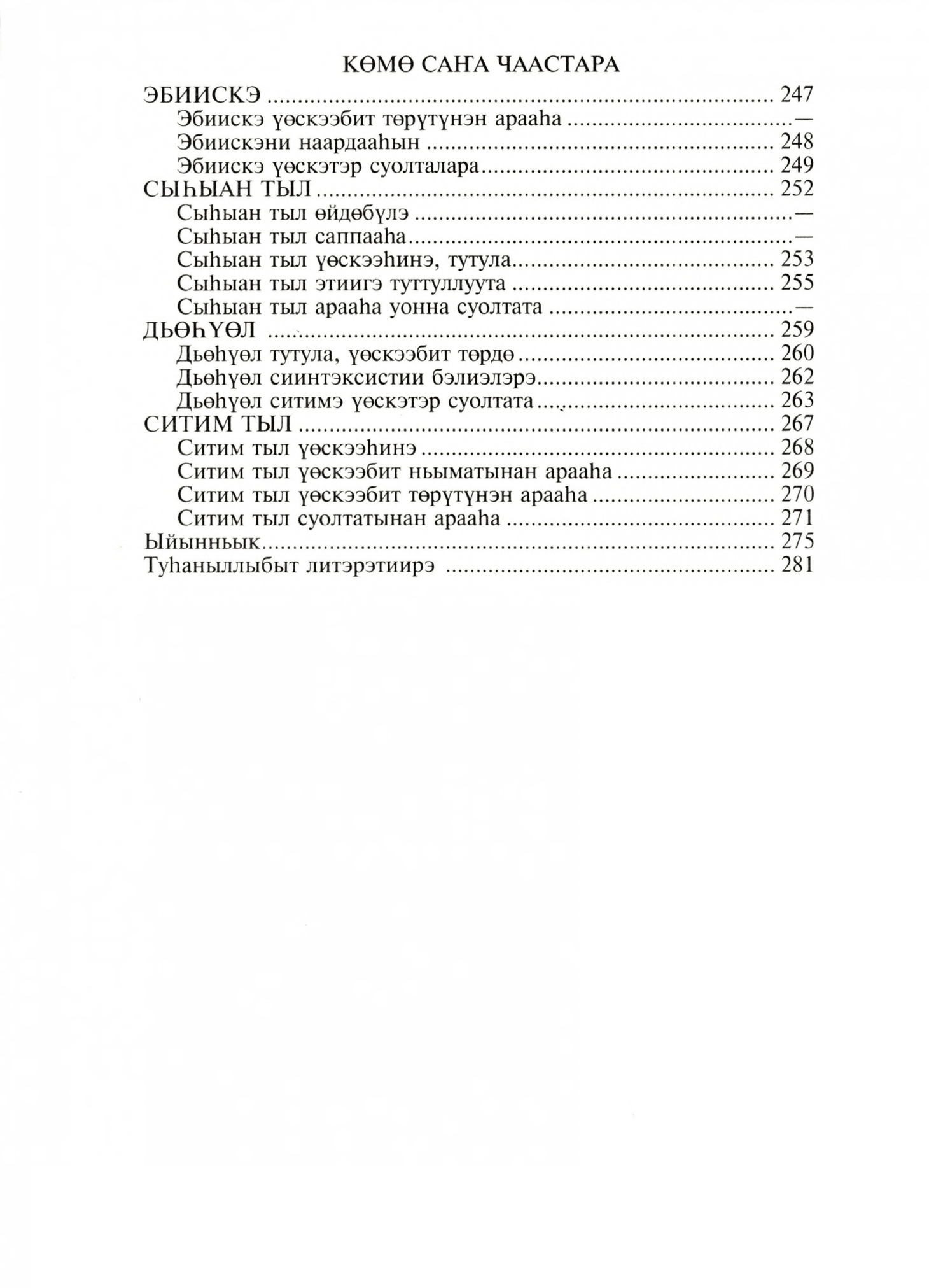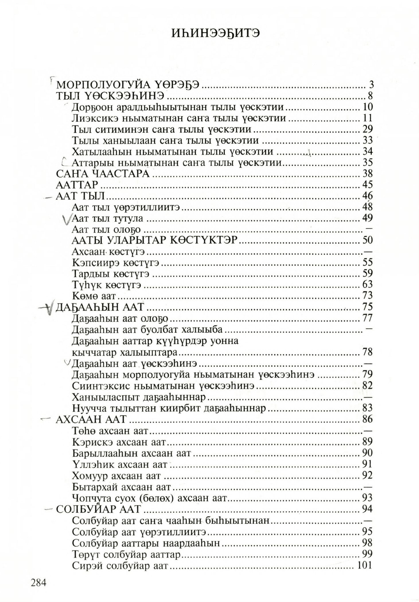 Саха билиҥҥи тыла. Морполуогуйа : устудьуоҥҥа аналлаах үөрэх кинигэтэ / [б.н.д., бэрэпиэссэр Н. К. Антонов уо.д.а. ; кылаабынай эрэдээктэр б. н.д., бэрэпиэссэр Г. Г. Филиппов] ; Саха Өрөсп. Бэрэсидьиэнин иһинэн Тыл бэлиитикэтин сүбэтэ, Саха өрөсп. номуукатын уонна идэ биэрэр үөрэҕин министиэристибэтэ, Бэдэрээссийэ үөрэҕин аагыныстыбата, М. К. Аммосов аатынан Саха судаарыстыбалыы үнүбэрситиэтэ, Саха тылын үөрэҕин уонна култууратын бакылтыата, Н. С. Григорьев аатынан саха тылын хаапыдырата. - Дьокуускай : Бичик, 2009. - 286, [1] с.