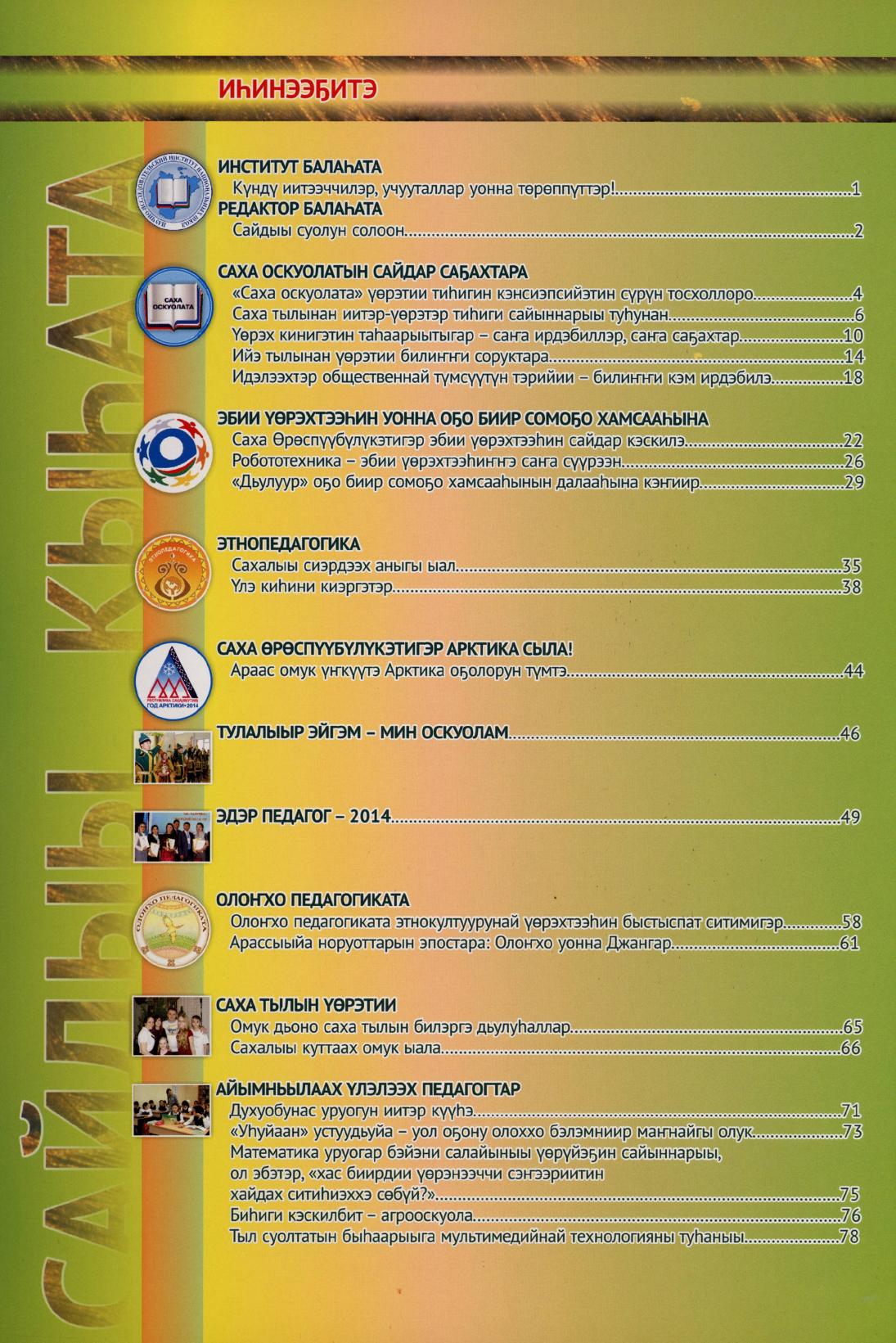Сайдыы кыһата : научно-методический журнал / гл. ред. А. Д. Саввинова. - Дьокуускай : Компания Дани Алмас, 2014, N 1 (1), тохсунньу - кулун тутар. - 78, [1] c.
