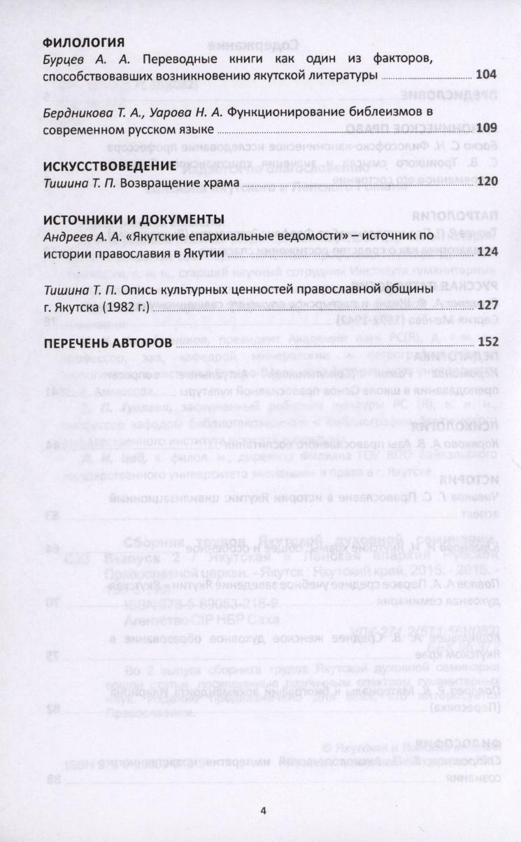 Якутская духовная семинария. Сборник трудов Якутской духовной семинарии = Collection of Research Papers of the Yakutsk Theological Seminary / Якутская и Ленская епархия Русской Православной Церкви ; [редколлегия: И. И. Юрганова (главный редактор), иеромонах Иларион (Варежкин), игумен Андрей (Мороз) и др.]. – Якутск : Якутский край, 2014 – . – ISSN 2686-9497.