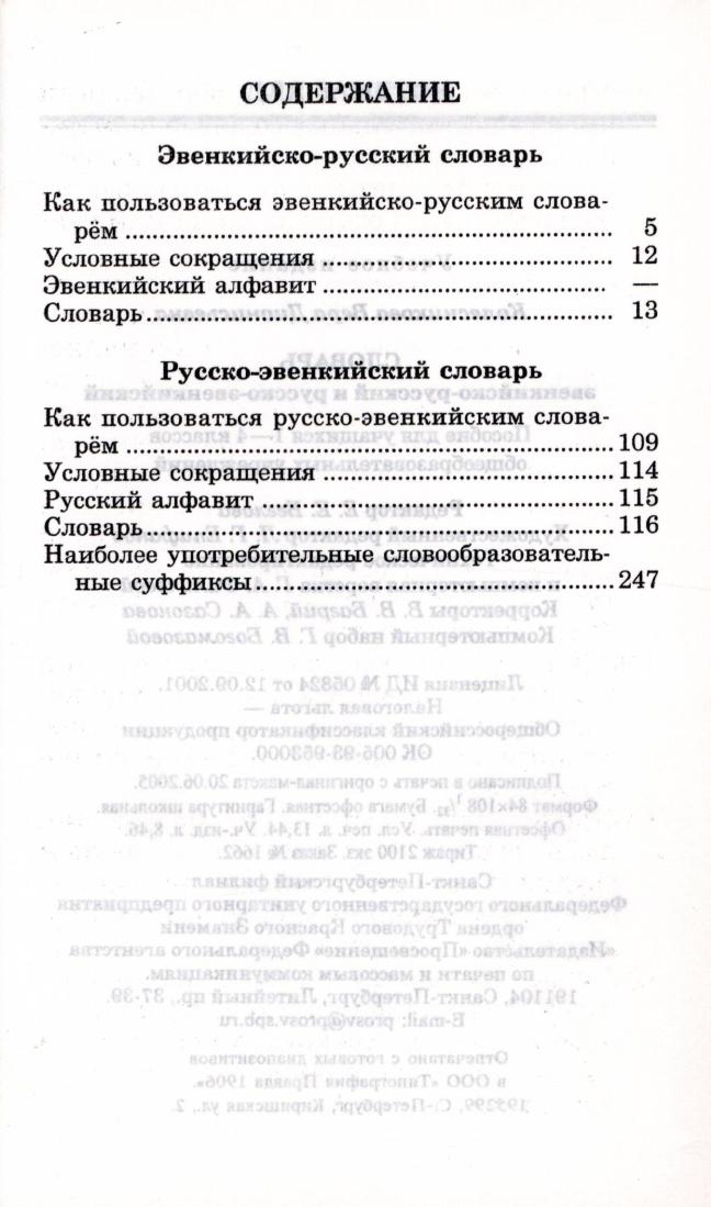 Словарь эвенкийско-русский и русско-эвенкийский : около 4000 слов : пособие для учащихся 1-4 классов общеобразовательных учреждений / Н. М. Колесникова. - 3-е изд., дораб. - Санкт-Петербург : Просвещение, Санкт-Петербургский филиал, 2005. - 249, [2] с.