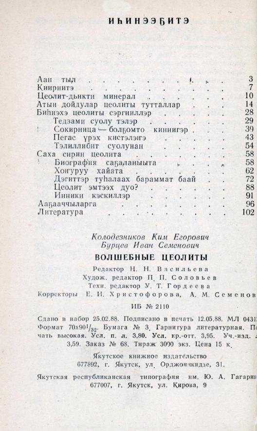 Аптаах цеолиттар / К. Е. Колодезников, И. С. Бурцев. - Якутскай : Саха сиринээҕи кинигэ издательствота, 1988. - 102, [2] с.