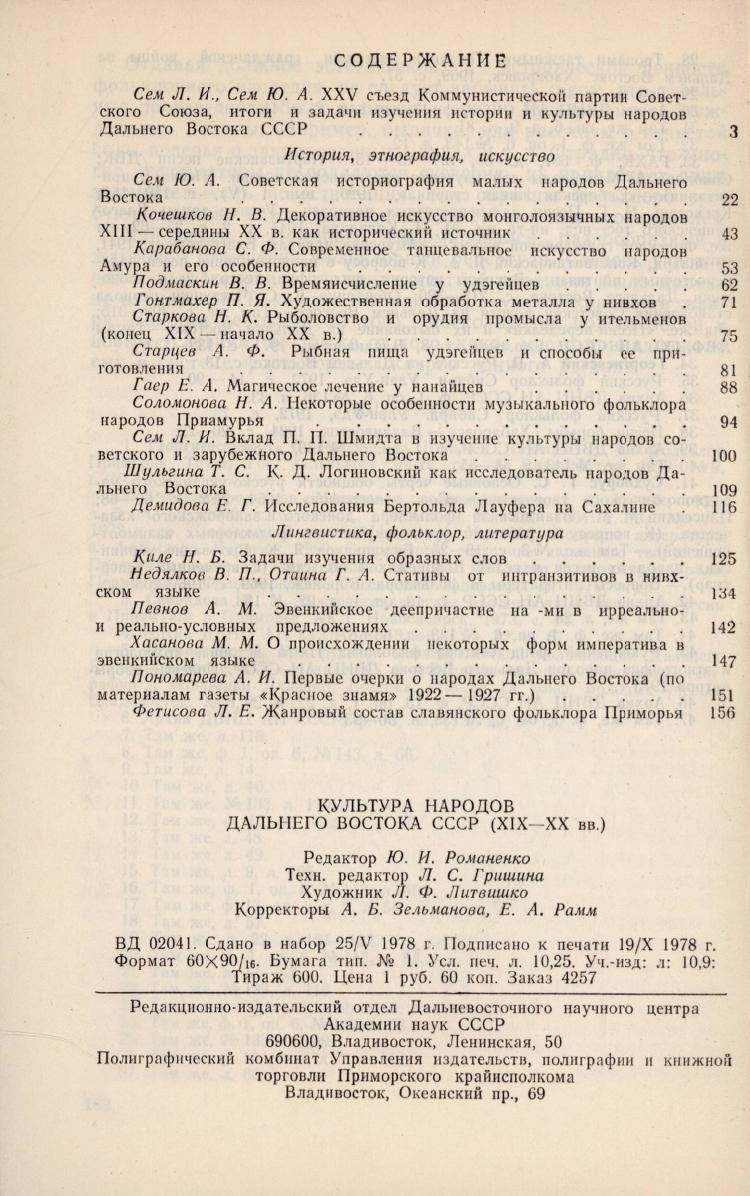 Культура народов Дальнего Востока СССР (XIX-XX вв.) ; Академия наук СССР, Дальневосточный научный центр, Институт истории, археологии и этнографии народов Дальнего Востока ; [редколлегия: Л. И. Сем (ответственный редактор) и др.]. - Владивосток : [б. и.], 1978. - 162, [2] с.