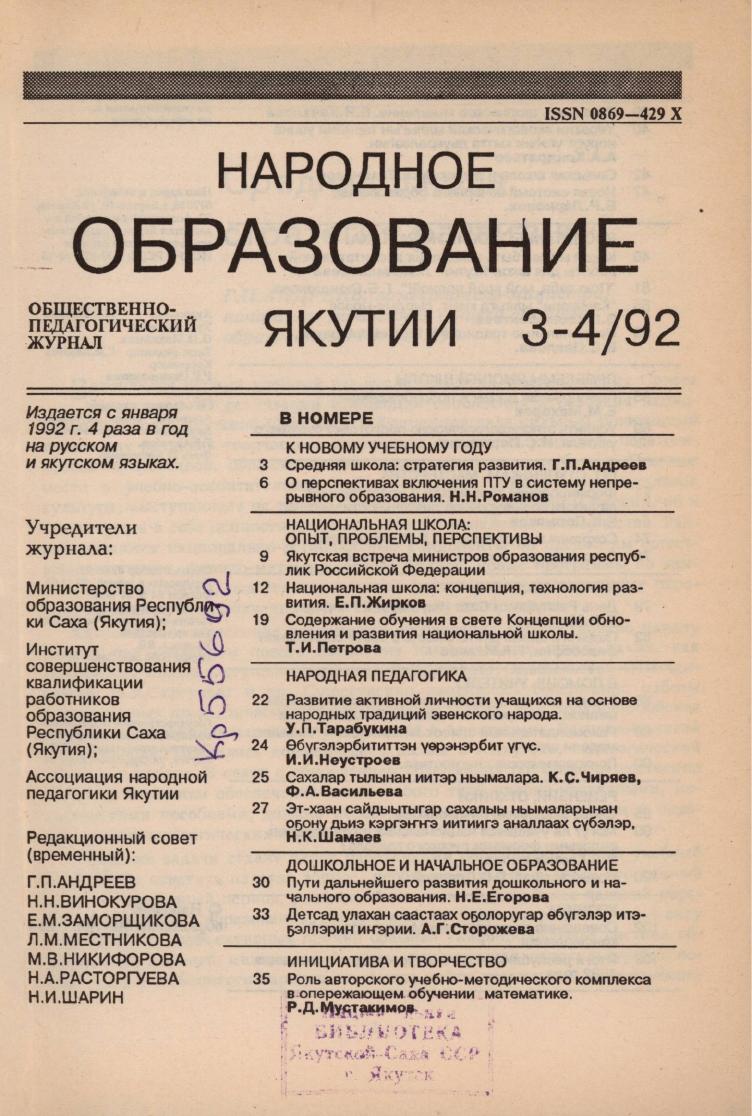 Народное образование Якутии : общественно-педагогический журнал. - Якутск : Сахаполиграфиздат, 1992