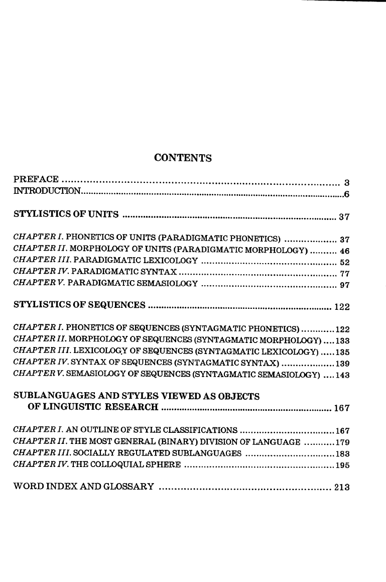 Построенный с учетом имеющейся учебной литературы по стилистике учебник не дублирует ее, демонстрируя строго системный характер стилевых явлений на лингвопсихологических областях частных языковых систем. Различаются "стилистика единиц" (выбор единиц из стилистической парадигмы) и "стилистика последовательностей" (типы сочетания единиц в тексте